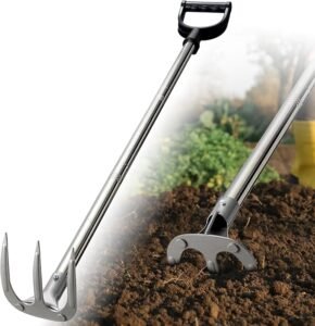 A long-handled 78-inch (approximately 198 cm) hand cultivator with three sturdy tines, designed for efficient weeding, soil loosening, cultivating, and light digging in gardens, raised beds, orchards, small farms, or potato harvesting. The extended length and ergonomic D-handle allow comfortable upright use without excessive bending, reducing back strain during prolonged tasks. Made from heavy-duty steel with a powder-coated finish for rust resistance and durability, the sharp, curved tines penetrate tough soil, break up clumps, remove weeds by the roots, and aerate effectively. The wide D-grip handle provides secure, two-handed control and better leverage for turning soil or pulling out stubborn plants. Ideal for gardeners, small-scale farmers, or anyone maintaining larger plots who prefers a standing tool over short-handled versions—combining reach, strength, and ease of use for weeding, tilling, and harvesting in one reliable, long-lasting cultivator.