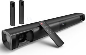 The soundbar can be wall-mounted to save space or placed on a desktop or TV stand for a clean and modern setup. Ideal for living rooms, bedrooms, or entertainment spaces, this surround sound system delivers powerful performance and an enhanced listening experience for everyday viewing and music enjoyment.