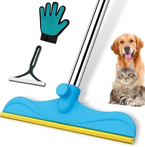 Keep your home fur-free with this 3-in-1 Carpet Rake Pet Hair Removal Kit, the perfect gift for pet owners. Featuring a 60” adjustable stainless-steel handle, handheld lint remover, and grooming glove, it tackles pet hair from carpets, rugs, couches, car mats, and more. The durable copper tines lift deeply embedded hair and dirt that vacuums miss, while its reusable, eco-friendly design saves money over sticky rollers. Easy to assemble and ergonomic, this pet hair remover makes cleaning faster and stress-free—ideal for dog and cat lovers alike.