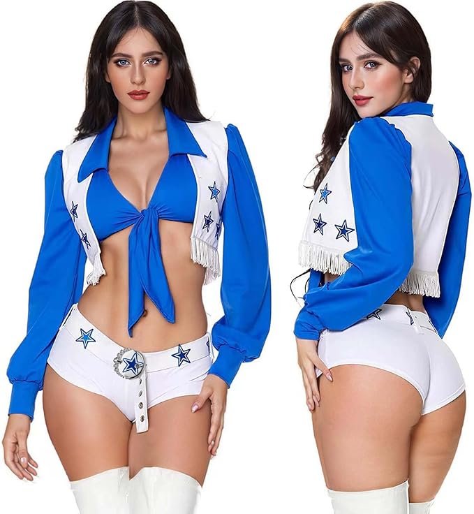 Cowboy Cheerleader Costume for Women – Blue Star Halloween Outfit with Shirt, Vest, Shorts & Belt