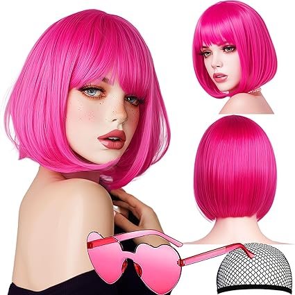 Bob Wig 12 Inch – Trendy Pink Short Bob Cosplay Wig, Heat-Resistant Glueless Wig with Cap & Sunglasses