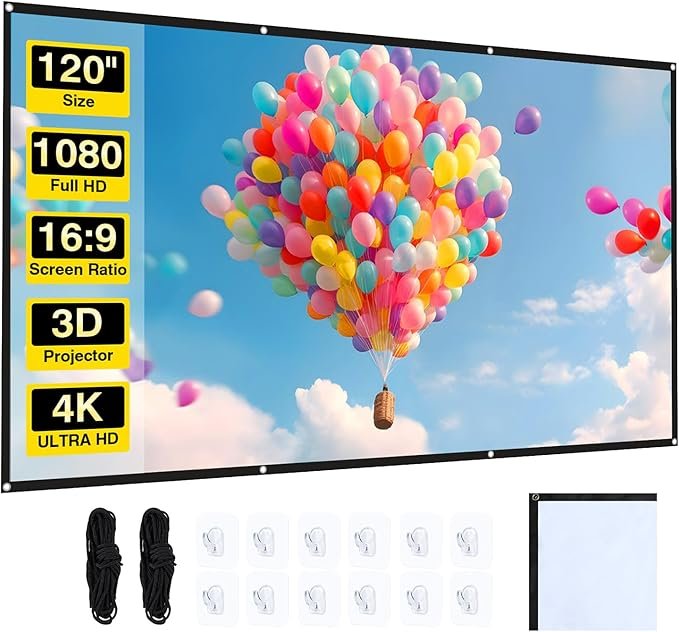 Enjoy cinema-quality viewing anywhere with the 120-Inch Projector Screen, perfect for home theater or outdoor movie nights. Made from premium thickened milk silk, this washable and wrinkle-resistant screen delivers sharp 4K Ultra HD visuals with vibrant colors. Its 16:9 aspect ratio and 160° wide viewing angle make it ideal for sharing movies, games, or presentations with family and friends. Lightweight and portable, it folds easily into a backpack and includes hooks and ropes for quick setup. Suitable for both front and rear projection, this projector screen is a versatile, must-have gift for entertainment lovers.